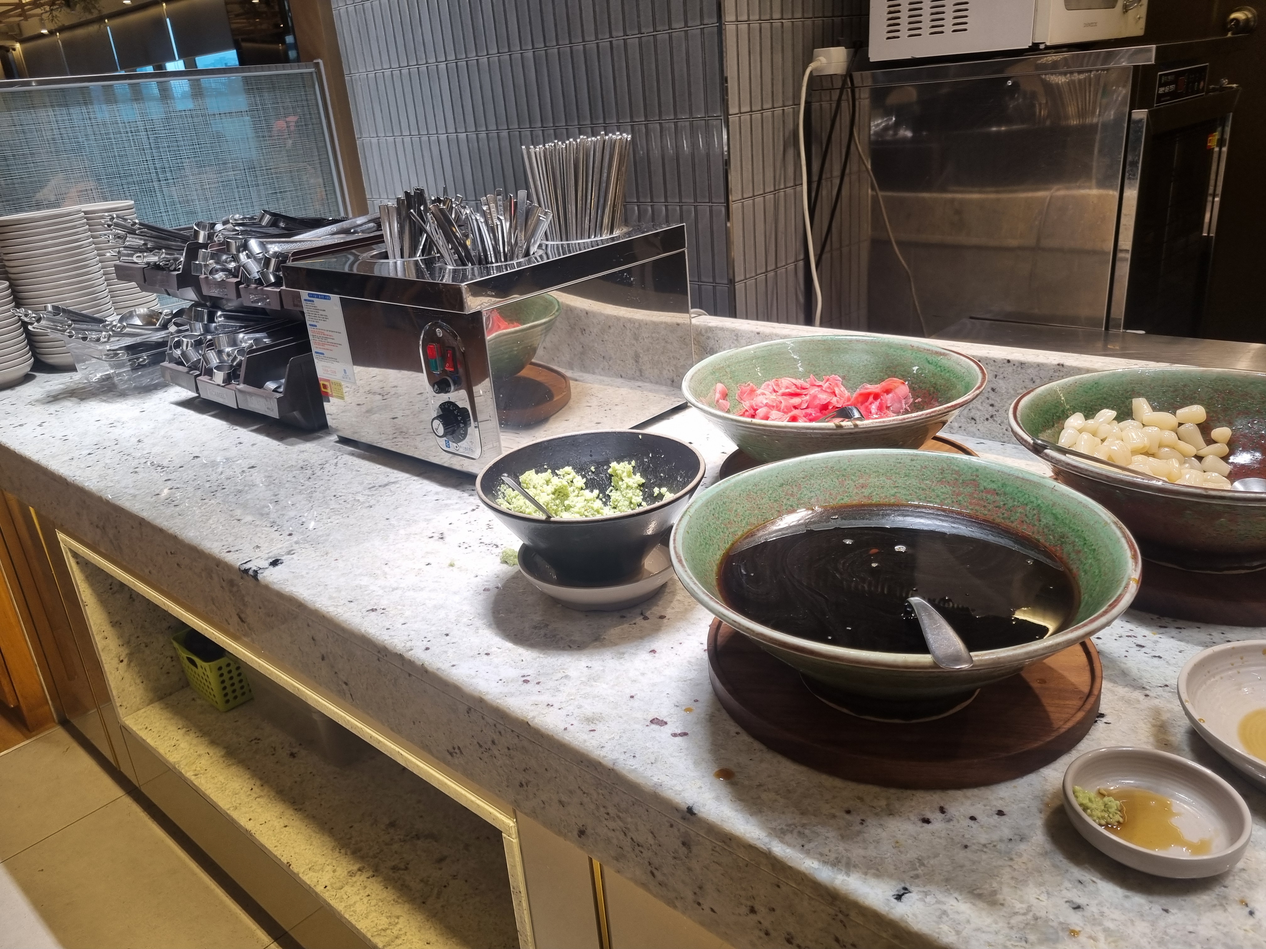 샤브야채 쪽에 양상추 샐러드도 있었고 그 옆엔 이렇게 소스와 피클 등도 있었습니다!
